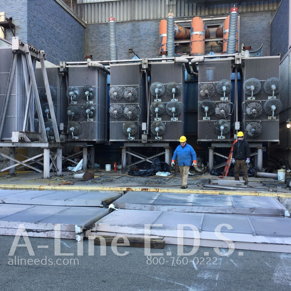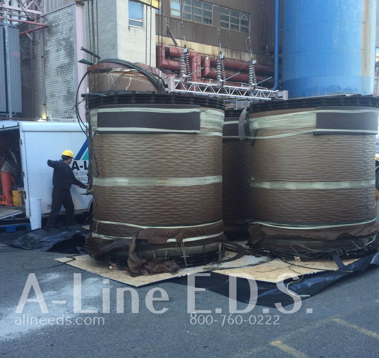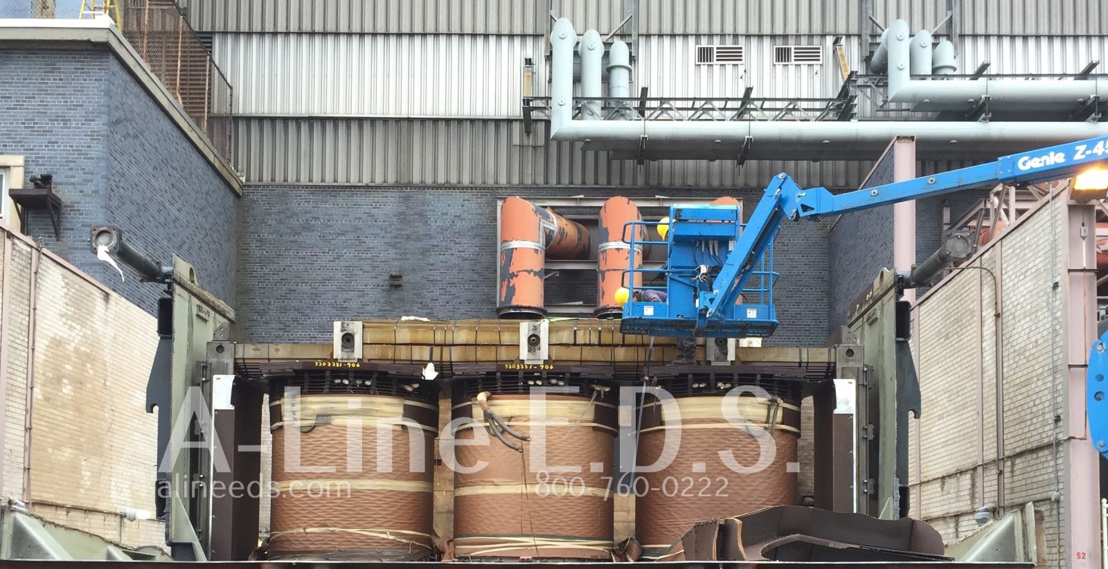 Below is another transformer removal that we performed in place. This 850,000 pound beast of a transformer needed to be removed during a small window of time in order for the replacement transformer to be assembled and fired up. After draining the oil, A-Line mobilized our crew for the dismantling. This location proved to be sensitive in every nature. Due to its proximity to a major waterway extra steps were taken in order to ensure no oil was on the ground. Its size and placement within the bay proved to be yet another challenge that A-Line took on and conquered with ease.