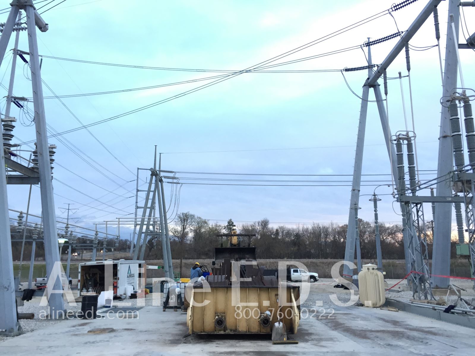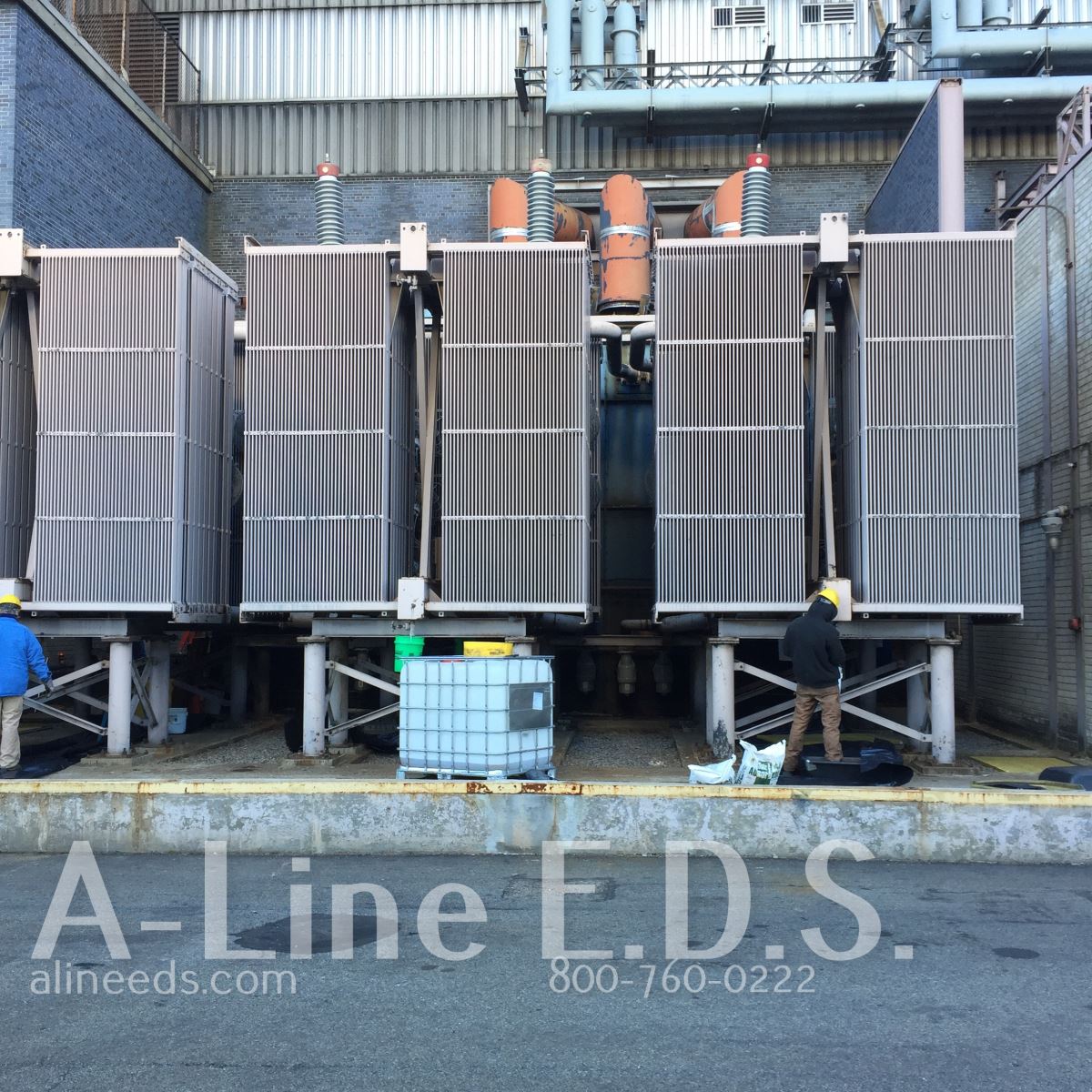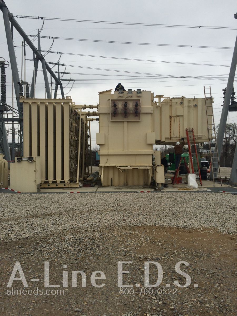 Below is another transformer removal that we performed in place. This 850,000 pound beast of a transformer needed to be removed during a small window of time in order for the replacement transformer to be assembled and fired up. After draining the oil, A-Line mobilized our crew for the dismantling. This location proved to be sensitive in every nature. Due to its proximity to a major waterway extra steps were taken in order to ensure no oil was on the ground. Its size and placement within the bay proved to be yet another challenge that A-Line took on and conquered with ease.